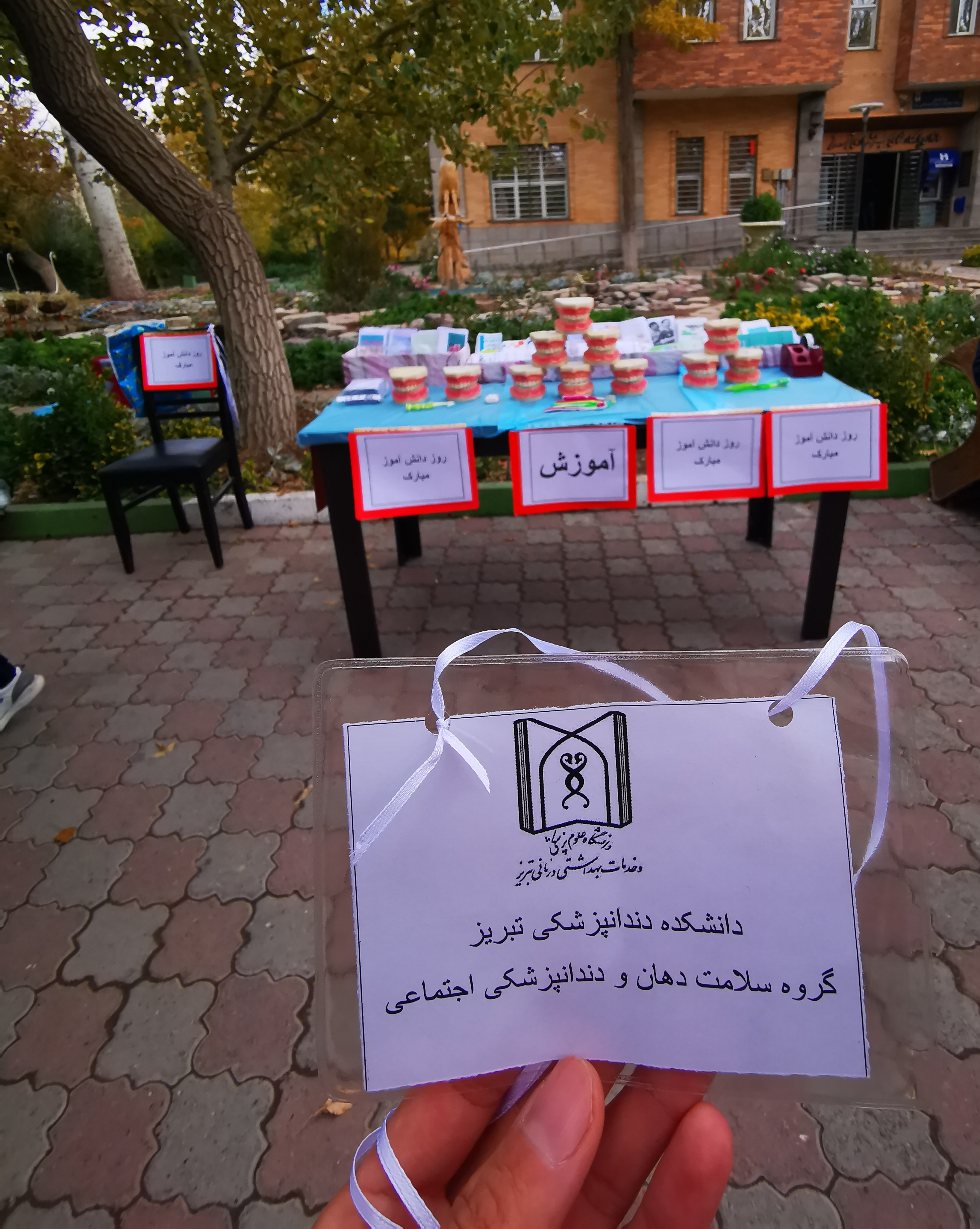 برنامه آموزش همگانی سلامت دهان و دندان به مناسبت روز دانش آموز ، جمعه 14 آبان 1400 در پارک ائل گلی تبريز از ساعت 10 الی 14 به همت گروه سلامت دهان ، دندان و دندانپزشکی اجتماعی با همکاری دانشجویان داوطلب ورودی 95 و با حضور تعدادی از دانشجویان ورودی 96 برگزار گردید. طی این برنامه دانشجویان با همراهی استادان و مسئول بخش گروه سلامت دهان به ارائه آموزش بهداشت و معاینه پرداختند و نیز مسابقه ای با موضوع پیام بهداشتی سلامت دهان و دندان برای کودکان و نوجوانان برگزار گردید که در پایان به برندگان جوایزی اهدا شد.