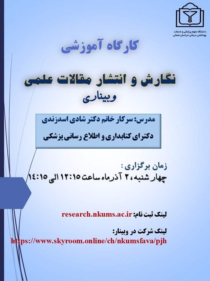 کارگاه آموزشی " نگارش و انتشار مقالات علمی" توسط دانشگاه علوم پزشکی خراسان شمالی با تدریس سرکار خانم دکتر شادی اسدزندی، دکترای کتابداری و اطلاع رسانی پزشکی چهارشنبه 2 آذرماه ساعت 12:15 الی 14:15 ویژه اساتید، پزشکان و دانشجویان برگزار می گردد. دارای امتیاز 1 آیین نامه ارتقا اعضای هیات علمی.