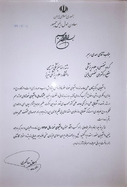 آقای دکتر مهدی رهبر ، دستیار تخصصی گروه ترمیمی ، بعنوان دانشجوی نمونه سال ۱۳۹۶ در مقطع تخصصی انتخاب شد. ایشان در مقطع دکتری حرفه ای نیز عنوان دانشجوی نمونه کشوری را کسب کرده بودند.