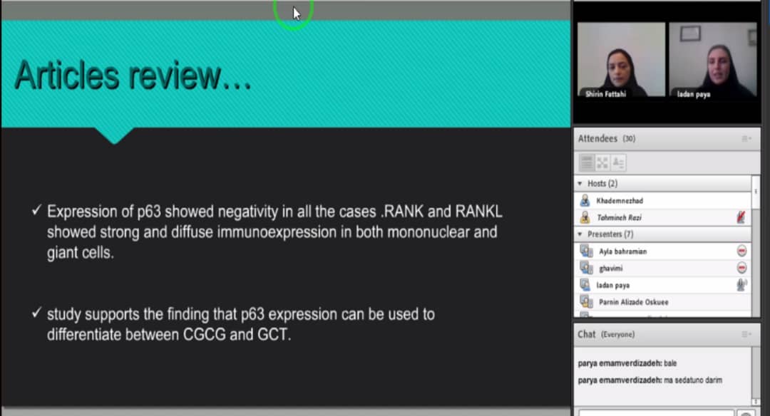 در راستای برگزاری برنامه های آموزشی مجازی دروس نظری دستیاران مطابق ابلاغیه ی دانشگاه ، جلسه ی سوم کلاس کنفرانس پاتولوژی بالینی (CPC) با مشارکت دستیاران و تعدادی از اساتید گروههای آموزشی جراحی دهان ، فک و صورت ، رادیولوژی دهان ، فک و صورت ، بیماری های دهان ، فک و صورت و آسیب شناسی دهان ، فک و صورت در تاریخ 98/12/26 بصورت آنلاین برگزار گردید.