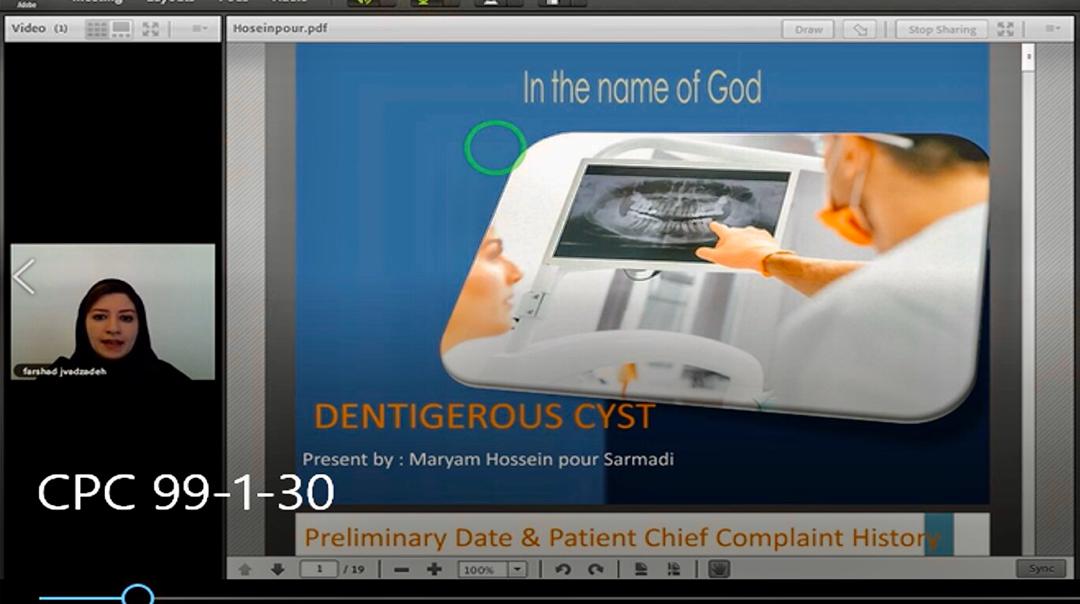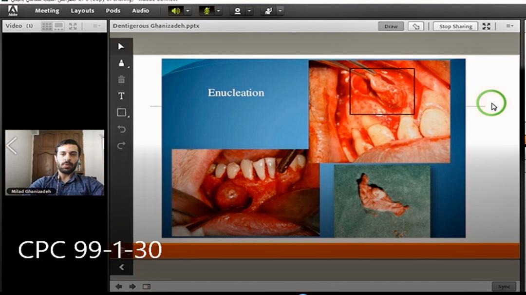 در راستای برگزاری برنامه های آموزش مجازی ، دروس نظری دستیاران مطابق ابلاغیه ی دانشگاه ، جلسه ی چهارم کلاس کنفرانس پاتولوژی بالینی (CPC) با مشارکت ۳۰ نفر از اساتید و دستیاران گروههای آموزشی جراحی ، رادیولوژی ، بیماری های دهان و آسیب شناسی در تاریخ ۹۹/۱/۳۰ بصورت آنلاین برگزار گردید.