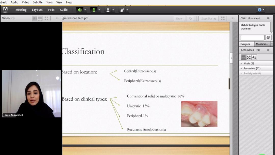در ادامه ی برگزاری برنامه های آموزش مجازی ، دروس نظری دستیاران مطابق ابلاغیه ی دانشگاه ، جلسه ی ششم کلاس کنفرانس پاتولوژی بالینی (CPC) با مشارکت ۳۰ نفر از اساتید و دستیاران گروههای آموزشی جراحی ، رادیولوژی ، بیماری های دهان و آسیب شناسی در تاریخ ۹۹/۳/۲۵ بصورت آنلاین برگزار گردید.